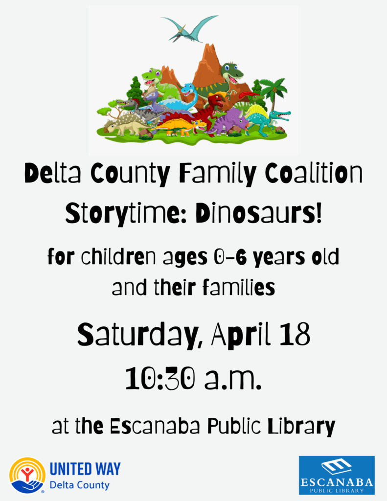 Delta County Family Coalition Storytime 10:30 am – 11:30 amApril 18, 2026 iCal Google View full calendar