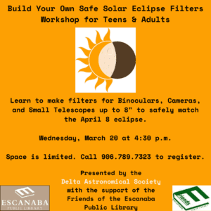 Wednesday, March 20 at 4:30 p.m. Build your own safe solar eclipse filter Workshop for teens and adults. Learn to make filters for binoculars, cameras, and small telescopes up to 8″.