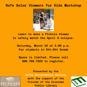 Presented by the Delta Astronomical Society and the Friends of the Escanaba Public Library. Both events will be held in the library.